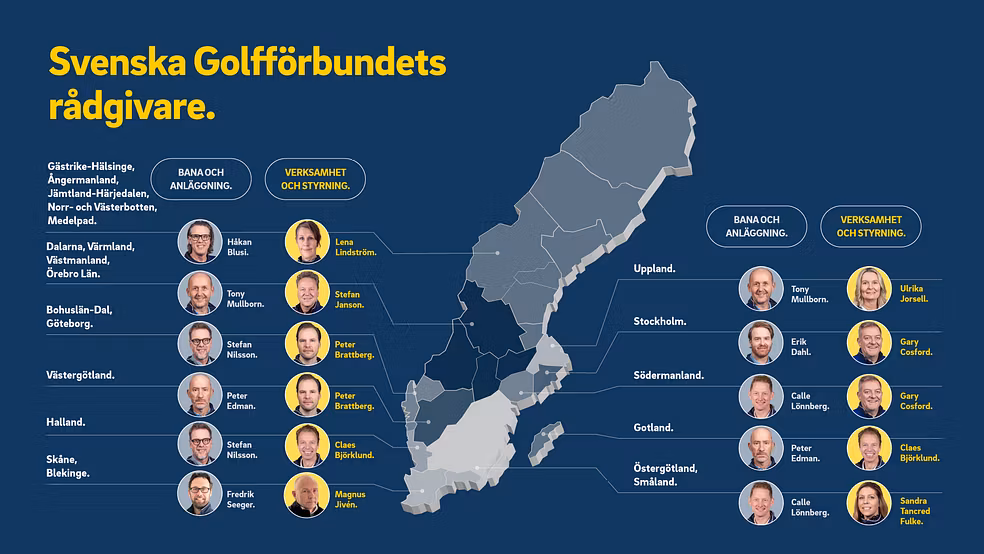Utöver rådgivarna inom verksamhet och styrning finns sju regionala rådgivare inom bana och anläggning. De hjälper dig och din golfklubb med råd och stöd kring idrott, organisation, ekonomi och ledarskap. Du hittar dem här.