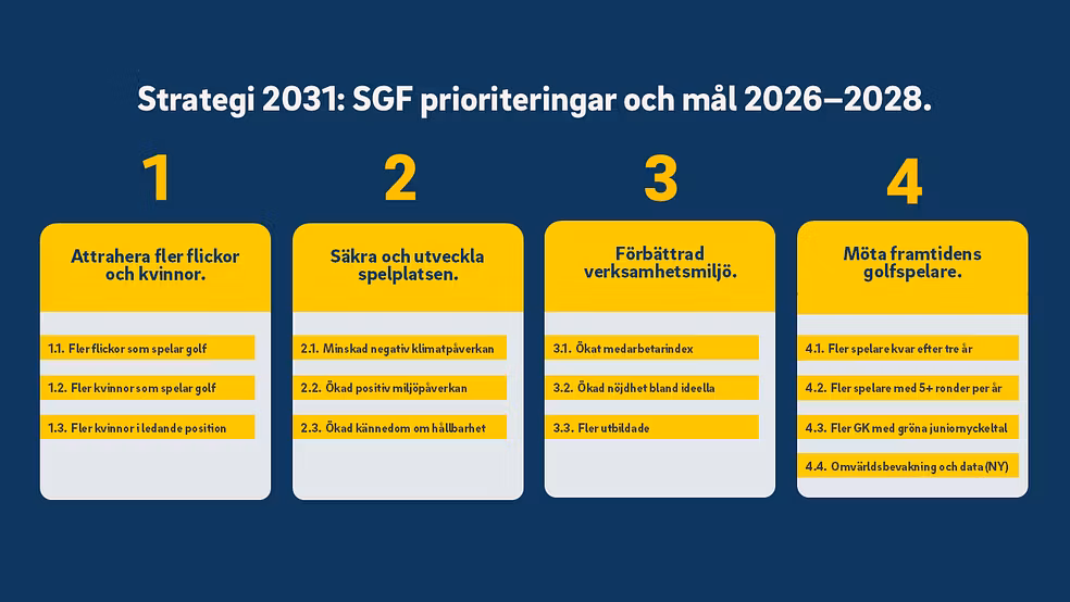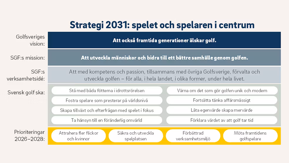 Strategi 2031 med dess ramverk och prioriteringar ska tillsammans göra att Golfsverige utvecklas positivt, i linje med vision, mission och verksamhetsidé.